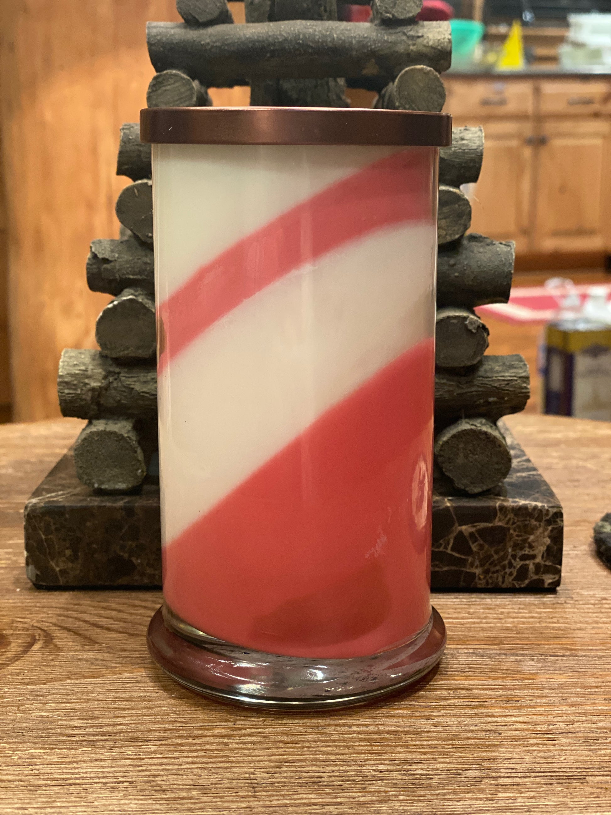 100% Pure Soy Wax Candle scented with peppermint essential oil. Colored red and white to look like a candy cane! Hand poured candles that are balanced to throw a clean scent while burning evenly and efficiently. This 18 oz. candle should burn approximately 130 hours with a three hour initial burn.