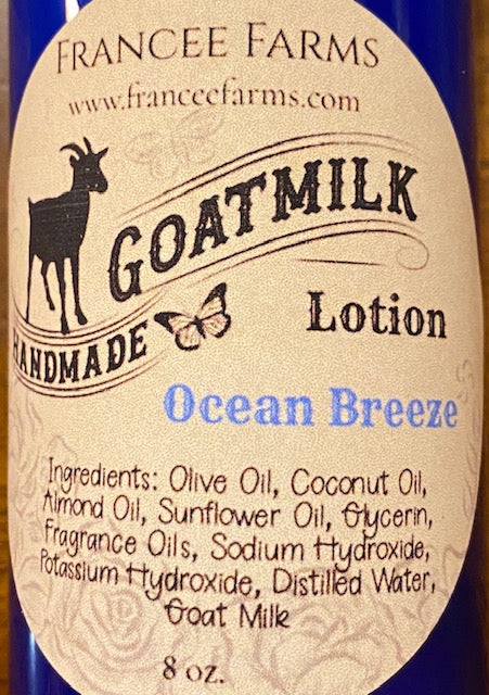 Ocean Breeze Goat Milk Lotion is a light, clean, refreshing scent that carries all of the benefits of goats milk products. High in vitamins A & D, it is very moisturizing and leaves your skin feeling refreshed and revitalized!